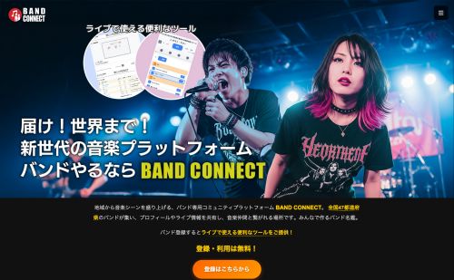地域から音楽シーンを盛り上げる!! バンド活動を支援する総合プラットフォームです。バンドの情報発信からライブ情報の共有、ライブにおけるサポートツールの提供など、音楽シーンを盛り上げるためのサービスを提供しています。
